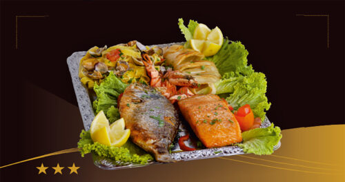 Gegrillte Fischplatte, verschiedene Spezialitäten für zwei Personen und Beilagensalat