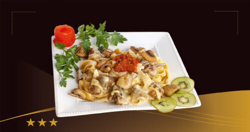 Mit Tomaten, Sahne, Champignons und Hinterschinken